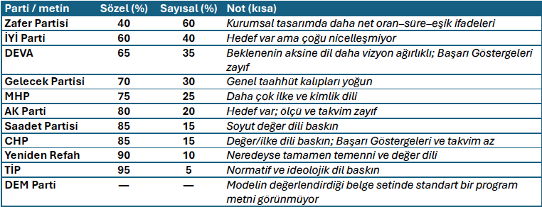 Bir noktada merak ağır bastı: “Bu sadece benim izlenimim mi, yoksa metnin dili gerçekten ölçülebilir hedeflerden kaçıyor mu?” Kabaca bir test yaptım. Parti programlarını ve program taslaklarını bir dil modeline verip metinde açık sayı/oran/süre, takvim, kurum–yetki tanımı ve ölçülebilir hedef içeren ifadeleri “sayısal”; değer–ilke–vizyon diline yaslanan, edilgen ve muğlak taahhüt kalıplarını “sözel” başlığı altında toplamasını istedim. Sonuç olarak model, bu iki dilin metin içindeki baskınlığına göre yaklaşık bir oran üretti.