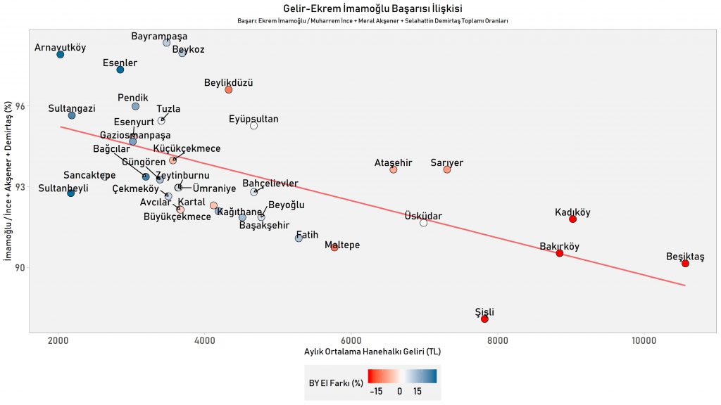 Ekrem İmamoğlu ise İnce, Akşener ve Demirtaş’ın toplam oyunu daha dar gelirli ilçelerde koruyabilmiş. Öte yandan Kadıköy, Bakırköy, Beşiktaş ve Şişli’de yüzde 10 civarında önemli bir kayıp var.