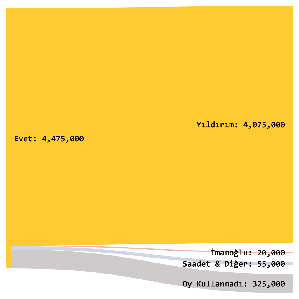 2017 referandumunda İstanbul’da Evet oyu 4 milyon 475 bin. 31 Mart’ta Evetçilerin yaklaşık 4 milyon 75 bini Binali Yıldırım’a yönelirken, sadece 20 bin seçmen İmamoğlu’nu tercih etmiş. Diğer partilere giden 55 bin Evetçi mevcut. 325 bin seçmenin ise 2017 referandumunda Evet oyu kullanmasına rağmen 31 Mart’ta sandığa gitmediği tahmin ediliyor.