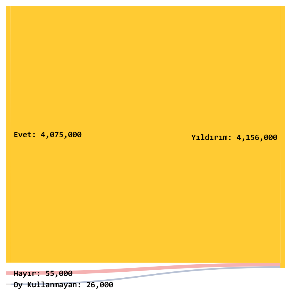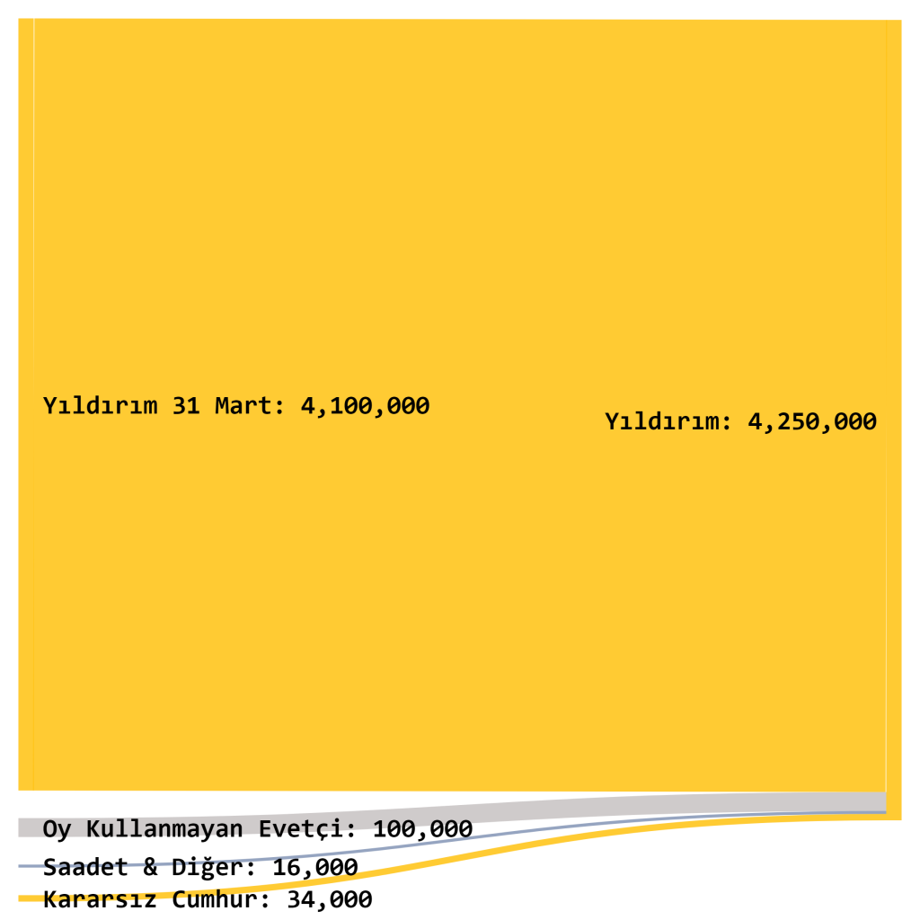 Buna göre Yıldırım 4 milyon 100 binden başladığı seçimlerde (4 milyon 75 bin Evetçi, 25 bin referandumda oy kullanmayan seçmen), söz konusu 100 bin seçmenin desteğiyle oyunu 4 milyon 200 bine çıkarıyor.