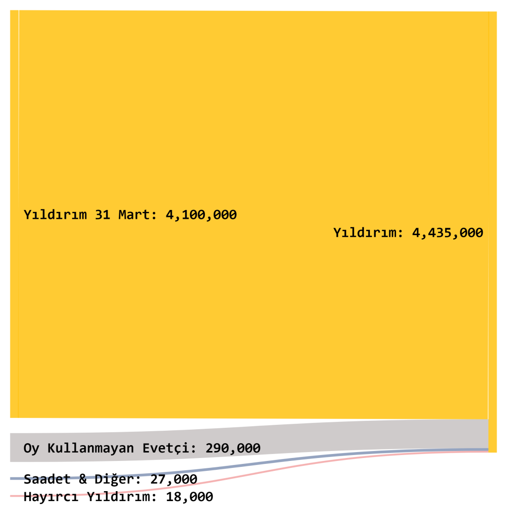 Referandumdaki Evet oyuyla kıyaslandığında (4,475 milyon), 4 milyon 246 bine gerileyen Cumhur İttifakı’nın böylece 229 binin Evetçinin oyunu kaybettiğini varsayabiliriz (Evet oyu sayısından mevcut Cumhur İttifakı oyunu çıkardığımızda: 4,475 milyon – 4,246 milyon). Buna göre Yıldırım’ın 31 Mart’ta sandığa gitmeyen 325 bin Evetçi arasında yaklaşık sadece 100 bin seçmenin desteğini alabildiği anlaşılıyor (31 Mart’ta oy kullanmayan Evetçilerden Haziran 2019’da muhalefet partilerine yönelen Evetçilerin sayısını çıkardığımızda: 325 bin – 229 bin).