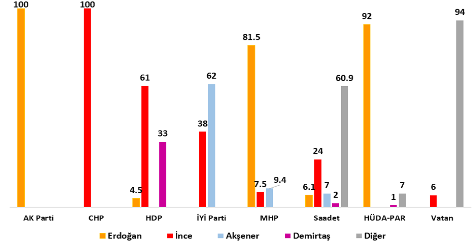 İstanbul’da 24 Haziran’da AK Parti’ye oy vermiş seçmenlerin %98.3’ü referandumda Evet oyu verirken, Cumhurbaşkanlığı seçimlerinde tamamı Erdoğan’ı desteklemiş. Bu iki sayının ortalaması olarak mevcut AK Partililerin %99’unun Binali Yıldırım’a oy vermesi öngörülüyor. MHP seçmeninin desteği referandumda %62 iken, Cumhurbaşkanlığı seçimlerinde %85’i buluyor. Beka söyleminin etkisi ve muhalif MHP’lilerin kararsız ve diğer parti gruplarına kaymasıyla beraber, kalan sadık partililer arasında Binali Yıldırım’a destek oranının %90’a yaklaşması muhtemel.
